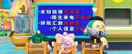 除了技术上的创新,《蛋仔派对》也注重通过线上活动加强反诈知识的科普教育。在游戏中,玩家可以通过诸多教育科普性的地图玩法,以第一视角亲身体验“骗局”,从而在趣味中学习反诈知识。通过游戏化学习的形式让更多人了解诈骗的流程以及该如何反诈,这样创新的科普形式也达到了事半功倍的效果。