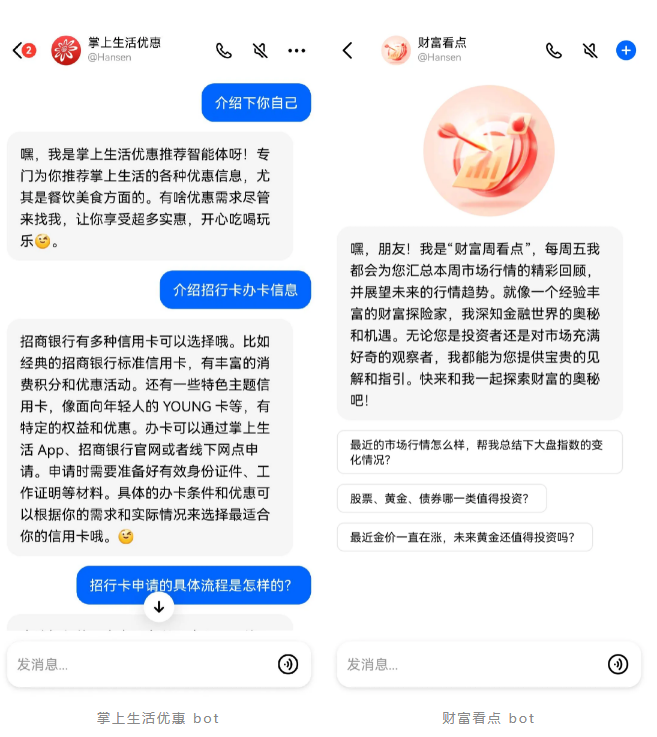 为加速智能化转型,招商银行正携手火山引擎等各界伙伴,全力推动 AI 创新从高性能基础设施向智能体等多元应用场景全面拓展。今年上半年,招商银行依托扣子平台打造的“掌上生活优惠”与“财富看点”两款金融智能助手(Bot)陆续在豆包APP 上线,成为首家入驻豆包APP 的金融机构。这两款智能助手通过自然流畅的语言交互,为用户带来了包括生活优惠查询、办卡指南、卡片权益解读、市场行情分析、资产配置建议等在内的一系列智能化、个性化的服务。