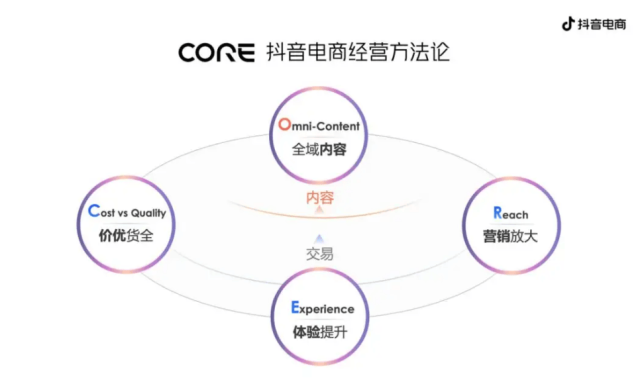 这些能够提升流量的经营动作,被抖音电商梳理成了CORE经营方法论,其中,C即Cost vs Quality价优货全、O即Omni-Content全域内容、R即Reach营销放大、E即Experience体验提升。