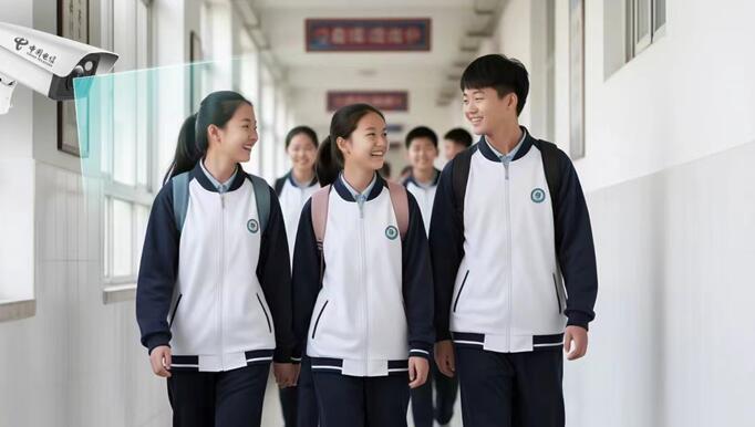 在湖北省某中学,天翼视联“平安校园”全面接入,覆盖校园内部的公共区域及周边。当有学生出现在天台、陡坡、水池等区域时,“平安校园”基于AI智能分析技术,识别风险事件并自动联动外部音柱进行警示语音播报,协助校园工作人员保障学生生命安全。