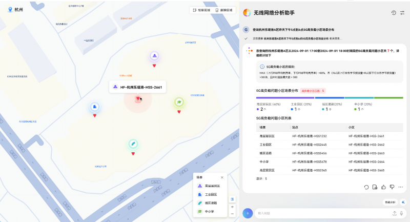 无线网络分析助手帮助网络优化工程师进行个性化网络实时分析与报告生成。利用通信大模型,实时学习和处理杭州现网2万台基站的通话统计、配置等数据,帮助网络优化工程师进行区域网络性能的管理,并支持对网络优化问题的深入定位。只需通过自然语言对话或简单的区域框选,就能生成个性化的网络分析报告,生成报告的时间可缩短至1分钟以内,相比原优化报表的构建时间减少90%以上,使网络管理变得更加简单、高效。