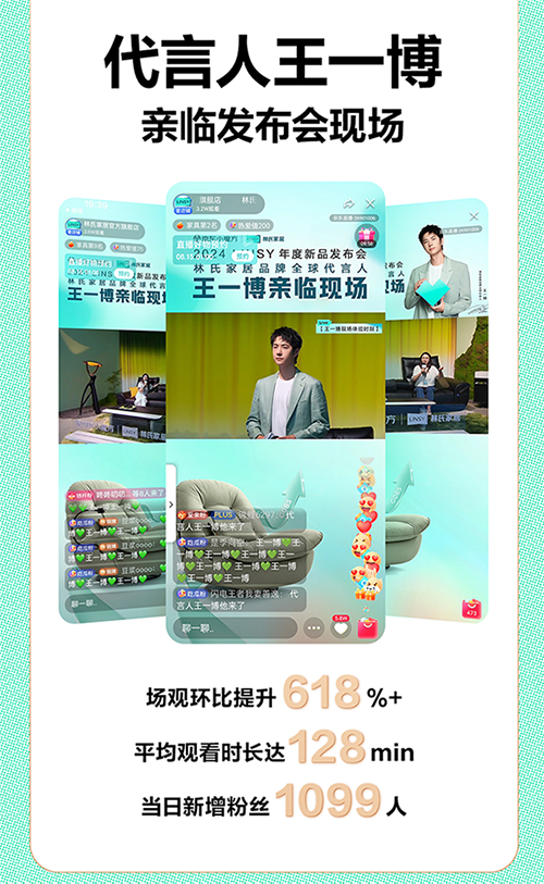 除此之外,京东小魔方作为关键一环,在新品上市时不但提供成功的方法论指导,还带来了重磅流量扶持,助推首发新品卖爆。在营销宣传方面,京东小魔方携手林氏家居搭建了线上直播,代言人王一博更是莅临现场,带动粉丝、销量双提升。据京东数据显示,当日直播场观环比提升618%+,平均观看时长达128S,当日新增粉丝1099人。此外,还有超40+达人、媒体嘉宾现场体验偏爱系列产品,多元、时尚、舒适的居家体验也获得了一致好评,强化消费者心中的新品记忆。