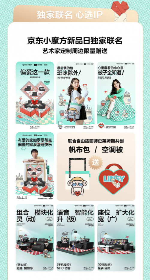 作为品牌新品首发的核心阵地和消费者购买新品的首选平台,京东小魔方新品日活动期间还有多重权益。例如前10名下单的消费者可半价购买,还有机会获得900元补贴券、联名款包包椅和艺术家联名的空调被、帆布包限定周边,还提供365天价保、6期免息、3年质保、以旧换新等服务保障,让消费者下单无忧。