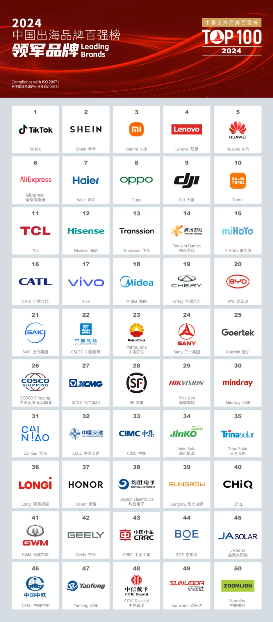 据悉,《中国出海品牌百强榜》是中国第一家由专业的国际品牌价值评估团队全程负责,参考国际标准化组织品牌评估标准ISO 20671的指标,使用经可信的第三方提供的数据进行公允评价的榜单,也是中国第一个综合考虑领军品牌和新锐品牌的出海品牌榜单。该榜单遵循国际品牌价值评估惯例,从中国和国际品牌榜单名录,筛选出超过1000个符合参选标准的品牌,经过全面深入的分析评价,综合评定出领军品牌50强和新锐品牌50强。