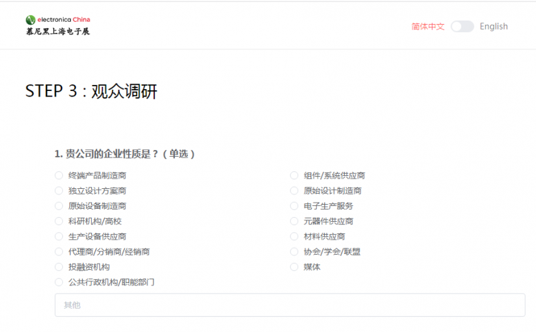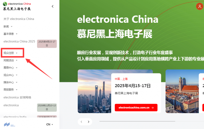 ①:登录展会中文官网:www.electronicachina.com.cn,点击左侧菜单栏中的“观众注册”进入网页端观众预登记界面;