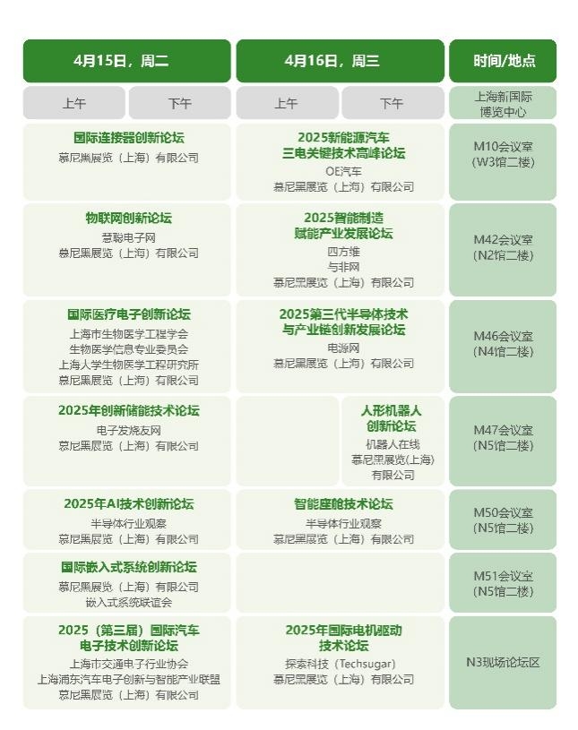 展会同期将举行精彩纷呈的“创新论坛”,紧紧把握电动车、汽车电子、人形机器人、三代半、嵌入式系统、人工智能、物联网、储能、智能制造、医疗电子、连接器、电机驱动、无人机等热门应用市场与高速发展行业,邀请来自电子行业、应用领域以及科研院所的业界领袖、技术专家、科研学者为与会观众答疑解惑,分享生产案例,提供先进技术解决方案,展望行业未来发展趋势。