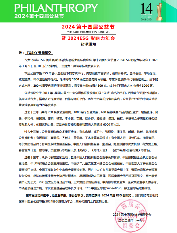 2025年1月9~10日,第十四届公益节暨ESG影响力年会在北京盛大召开,吸引了来自社会各界的企业精英、公益达人以及权威专家学者,共同探寻企业社会责任与可持续发展的全新路径。天趣星空TQSKY作为科技领域的创新领军者,在此次盛会上荣获“2024年度ESG创新奖”,成为全场瞩目的焦点。