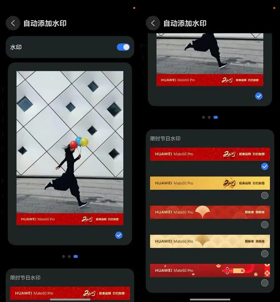 如果大家和我一样喜欢拍照记录生活,那么原生鸿蒙系统这次新增的限时节日水印一定要速速用起来~在【相机-设置-自动添加水印】中,有五款福气满满的新春照片水印可供选择。无论是拍摄热气腾腾的年夜饭、与家人的幸福合影,还是跟朋友的欢乐相聚,有了新春水印加持,喜气一定加倍!