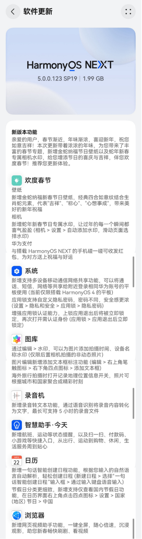新年到,接“鸿”运!再有几天,2025乙巳蛇年春节就要来了,原生鸿蒙也在年前推送了更新(版本号5.0.0.123 SP19)。新版本中加入了诸多蛇年春节元素,不仅有专属的新春壁纸、照片水印等喜气盈盈的氛围感“妆造”,华为支付更支持碰一碰发红包功能,为春节增添仪式感,此外图库、日历、录音机等应用的功能也全面进化,非常推荐大家升级体验!