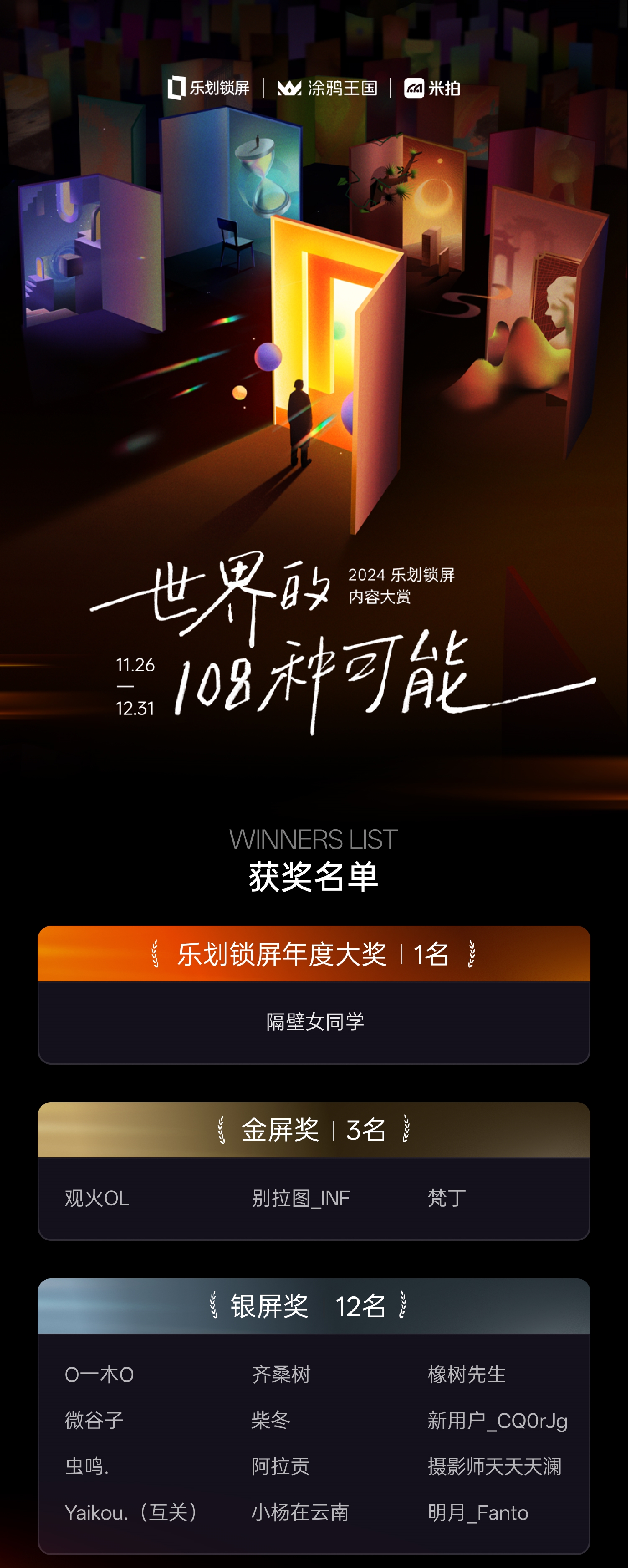 1 月 25 日,2024 乐划锁屏内容大赏获奖名单重磅公布。这场以 “世界的 108 种可能” 为主题的赛事,收到超 2 万组投稿作品,160 位创作者脱颖而出,共享高额现金奖励及平台推广扶持权益。
