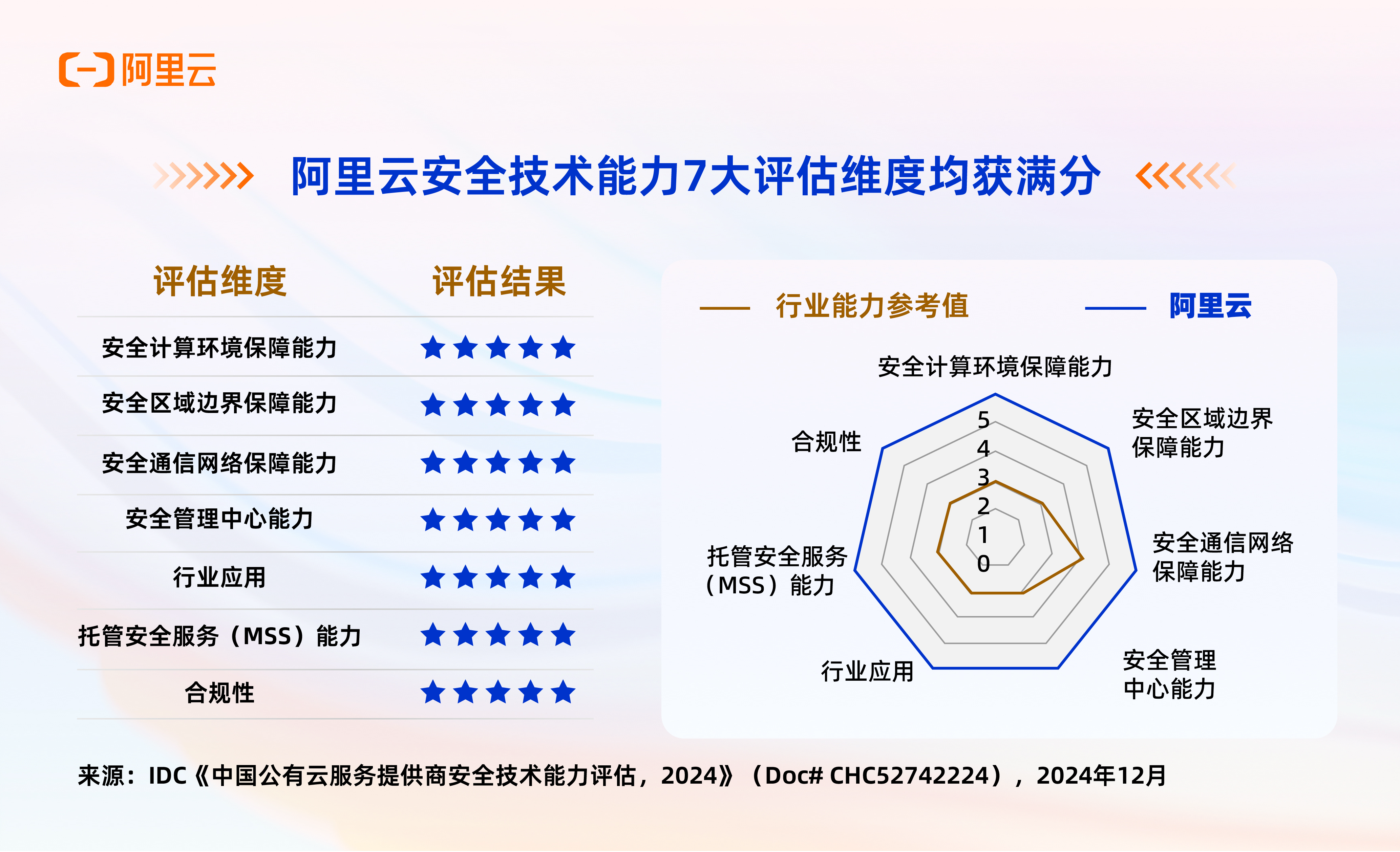 图:IDC《中国公有云服务提供商安全技术能力评估,2024》阿里云安全能力评分