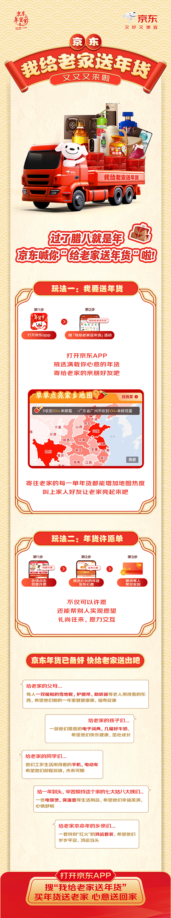 据悉,1月6日至2月12日期间,消费者可通过京东APP参与“我给老家送年货”活动,为家人送上祝福和年货。消费者购买指定商品后,京东将同步送达好礼和心意。购买商品的消费者还能参与“点亮家乡地图”互动活动,为收货地所在的家乡增添热度,将承载着祝福的年货送往更多更远的地方。此外,1月8日-10日每天9点,打开京东APP搜索“真便宜”,进入“京东真便宜采销直播间”围观光明村新春大集,还可轻松选购东哥同款年货商品,更有百万红包等惊喜福利。