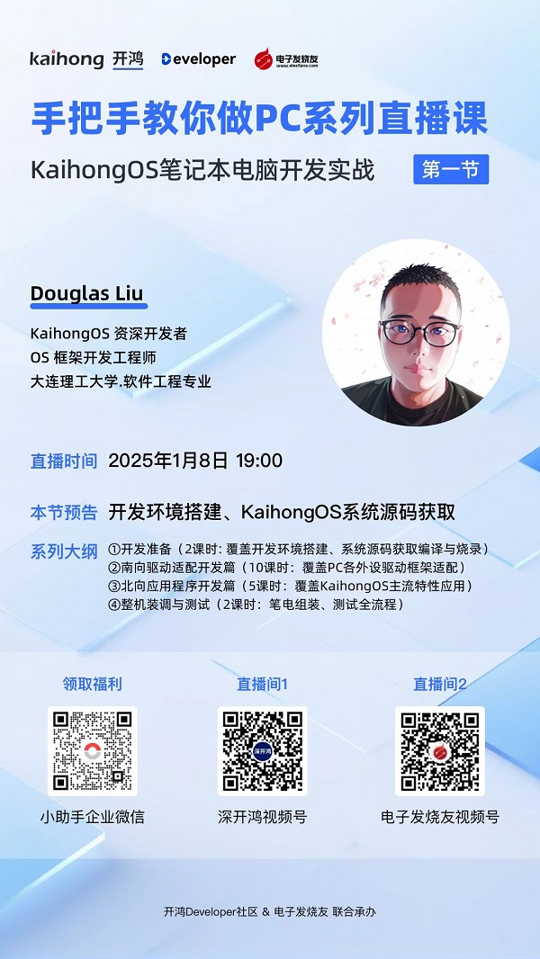 首节课程《KaihongOS笔记本电脑开发实战①——开发环境搭建及系统源码获取》将于1月8日19:00开播!深开鸿计划每双周在视频号进行直播,确保每位学员都能紧跟课程节奏,收获满满!诚挚欢迎各位开发者积极参与,共同感受KaihongOS的魅力!