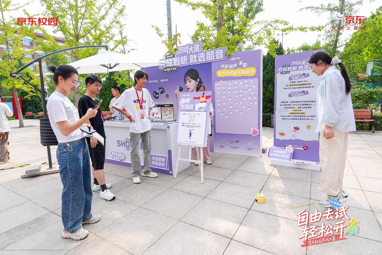 韶音“开放聆听 就选韶音”展区创意十足,开放式耳机创新环绕耳夹设计带来全新聆听体验。学生们在宣言墙上写下新学期目标,佩戴试听后分享感受即可获得明星联名健身弹力带。学生优惠低至95折的优惠政策让许多学生现场下单。