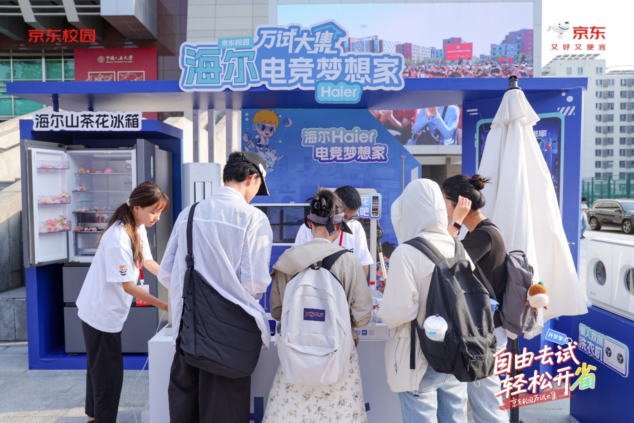 海尔“电竞梦想家”展区融合AI家电与电竞场景,智能家电产品展示科技生活的无限可能。学生们与海尔家电合影打卡,带话题发布小红书即可获得限量礼品,未来科技体验吸引众多学生参与。