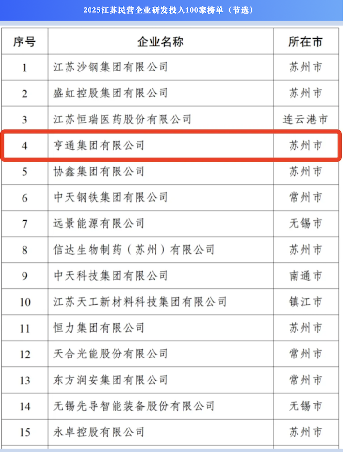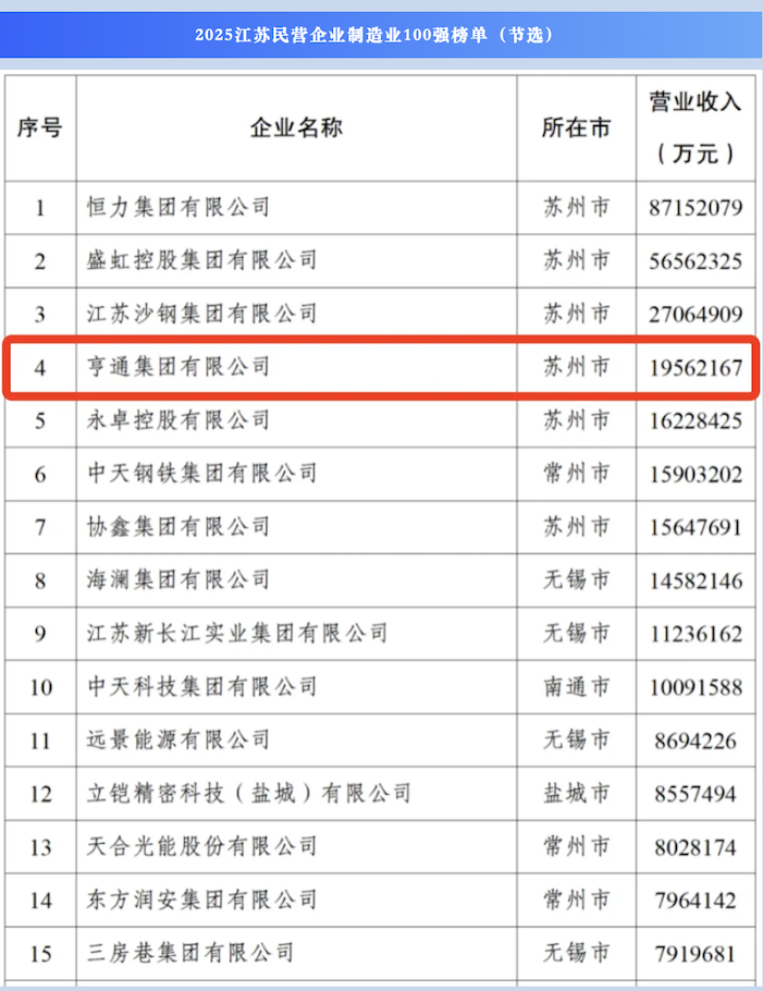 10月12日,2025江苏民营企业百强发布活动在徐州举行。省委常委、省委统战部部长胡广杰出席活动并讲话,省委统战部副部长、省工商联党组书记刘军主持活动。省发改委、省科技厅、省工信厅,省工商联有关领导,及各设区市工商联负责领导,百强民营企业代表等参加活动。会上,省工商联主席刘聪发布江苏民营企业百强系列榜单,亨通集团排名再进一步,位列“2025江苏民营企业200强”第4位、“2025民营企业制造业100强”第4位、“2025民营企业研发投入100家”第4位。