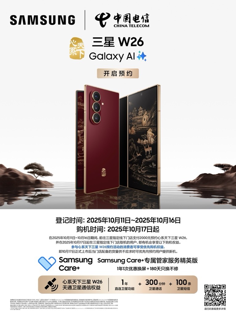 从匠心材质到全新色彩,从轻盈大屏到智慧交互,心系天下三星W26融合匠心精神与科技体验,不仅是三星W系列第18代的全新作品,更是东方意蕴在当代科技语境下的一次升华。器物之道,在此化为生活之美;匠心传承,在此凝为时代之境。心系天下三星W26现已正式开启预约。即刻加入尊贵序列,体验科技与美学的经典融合,见证高端格局的再一次进阶。