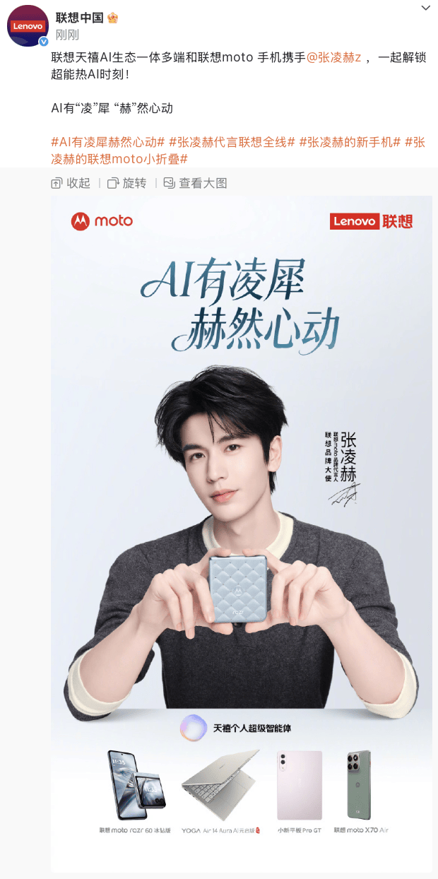联想官宣联想品牌大使及联想moto品牌代言人张凌赫,天禧个人超级智能体或将全新升级
