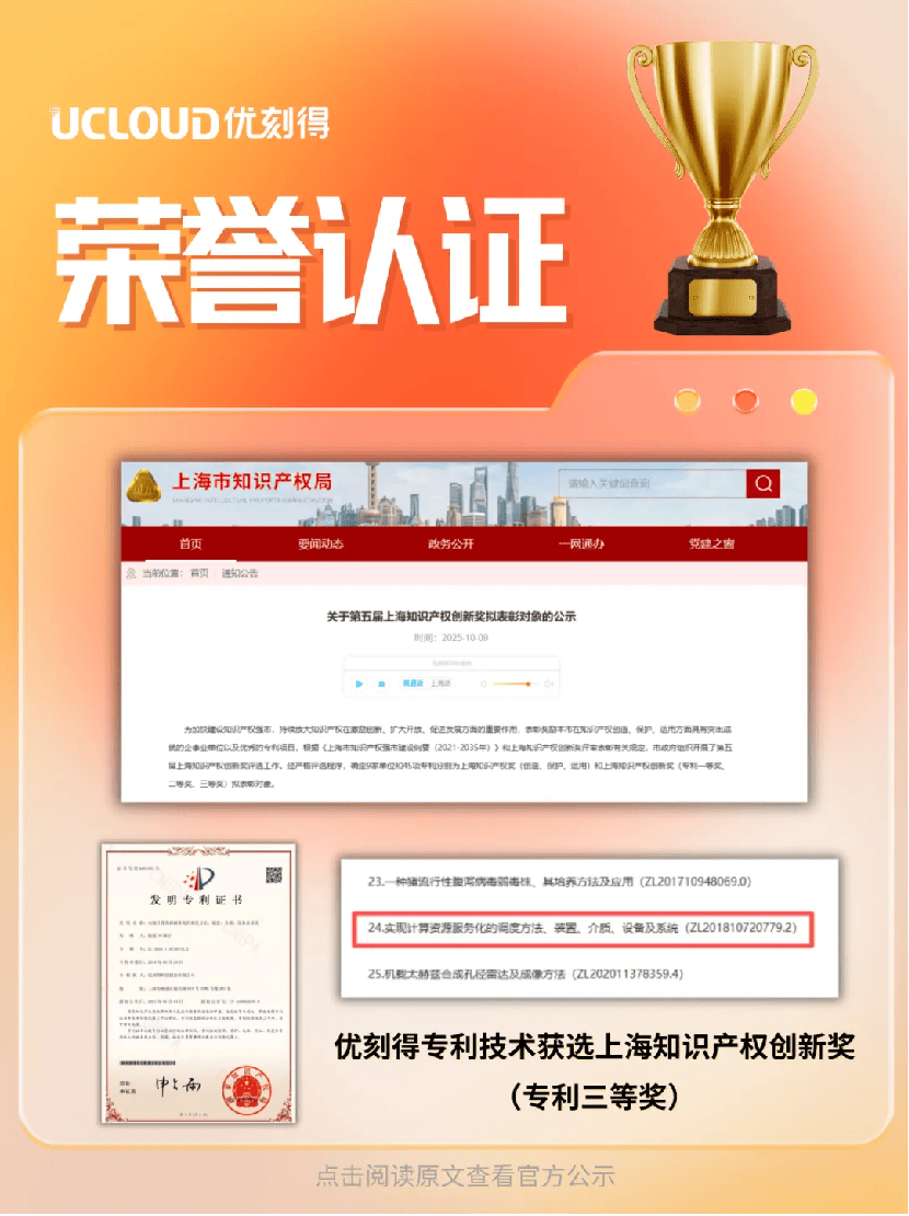 第五届上海知识产权创新奖表彰对象正式公布,优刻得专利技术「实现计算资源服务化的调度方法、装置、介质、设备及系统(ZL201810720779.2)」荣获上海知识产权创新奖。这项专利技术的核心在于——通过容器化和智能调度机制,将云平台中的闲置物理资源转化为可灵活调用的计算资源池。