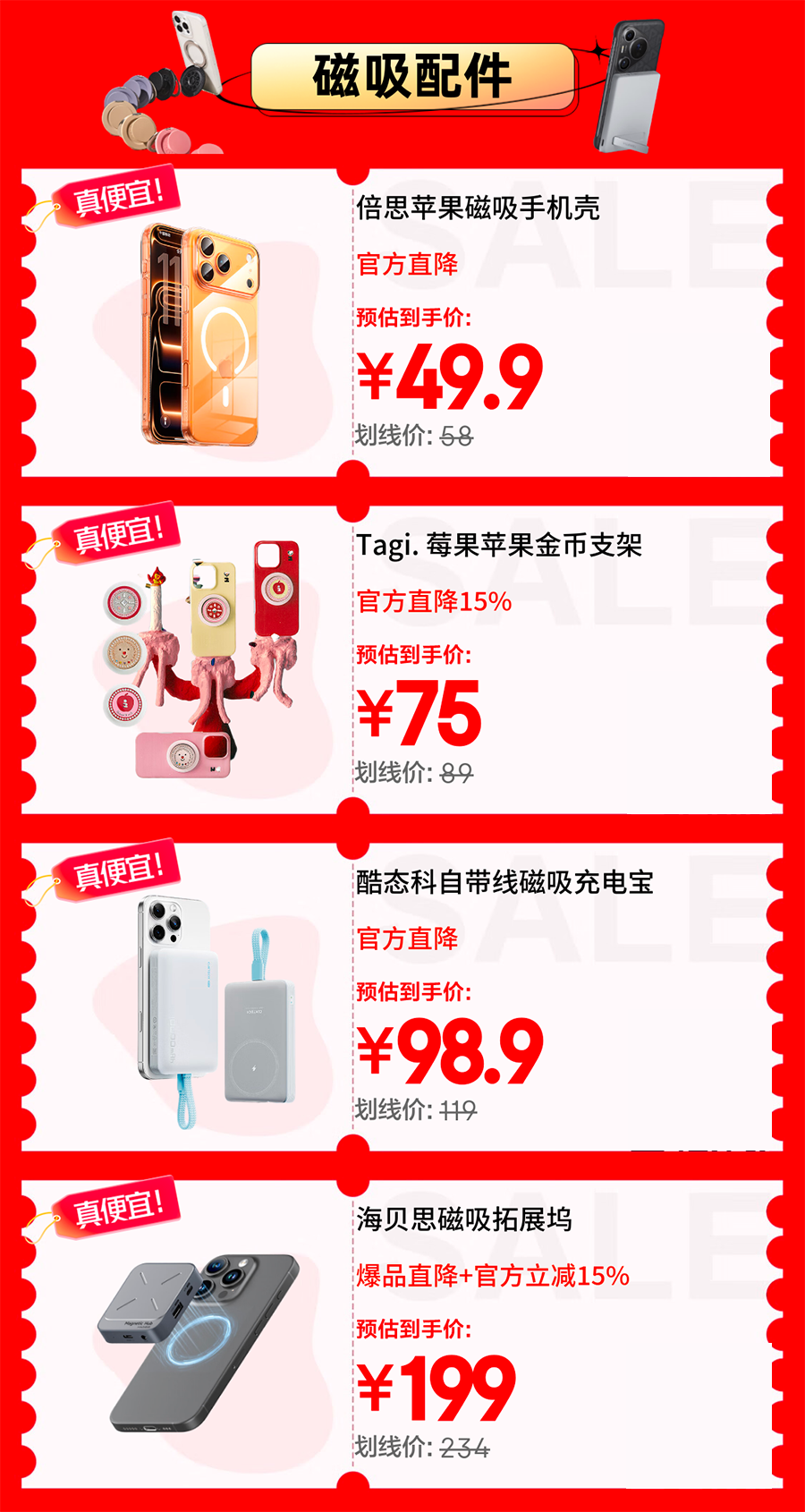告别繁杂线材,磁吸配件让连接更轻松、使用更自由。倍思苹果磁吸手机壳,有效防止刮擦,强磁吸附兼容多种配件,支持无线充电与车载导航,京东11.11预估到手价49.9元;Tagi莓果苹果金币支架,一贴即合,多角度自由支撑,京东11.11预估到手价75元;酷态磁吸充电宝,自带线材,吸附即充,出行更便捷,京东11.11预估到手价98.9元;海贝思磁吸拓展坞,轻松扩展多种接口,移动办公更高效,京东11.11爆品直降叠加官方立减15%,预估到手价199元。