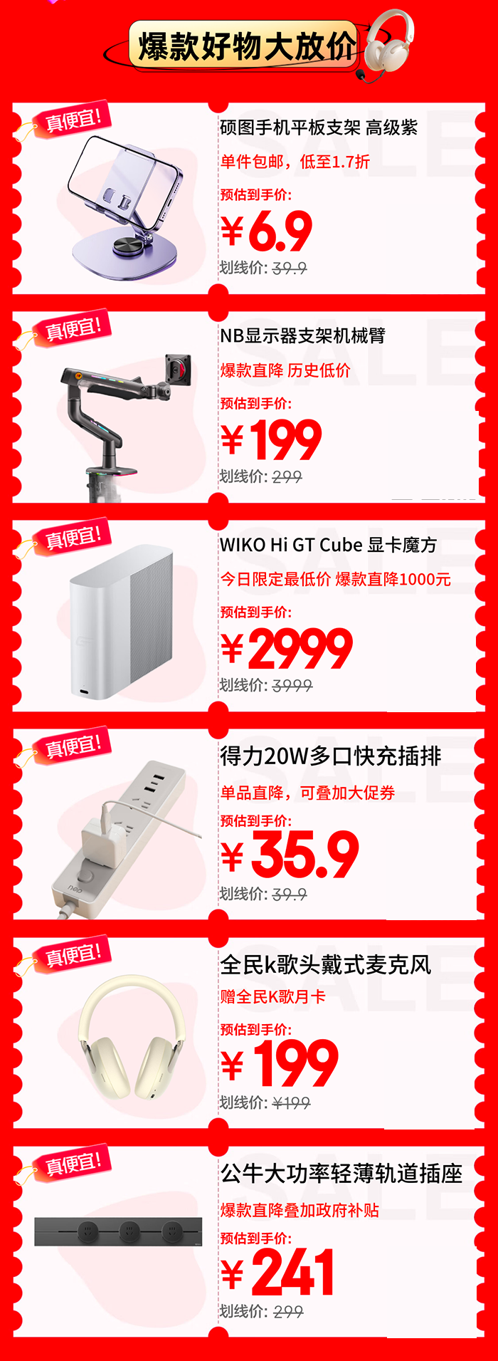 此外,京东11.11还有多款高性价比3C配件持续放价。其中,硕图手机平板支架限时1.7折,单件包邮,预估到手价只需6.9元;NB显示器支架机械臂爆款直降,预估到手价199元;WIKO Hi GT Cube显卡魔方,爆款直降1000元,预估到手价2999元;全民K歌头戴式麦克风,预估到手价199元,还赠全民K歌月卡;得力20W多口快充插排,单品直降还可叠加大促券,预估到手价35.9元;公牛大功率轻薄轨道插座,爆款直降叠加政府补贴后预估到手价241元。