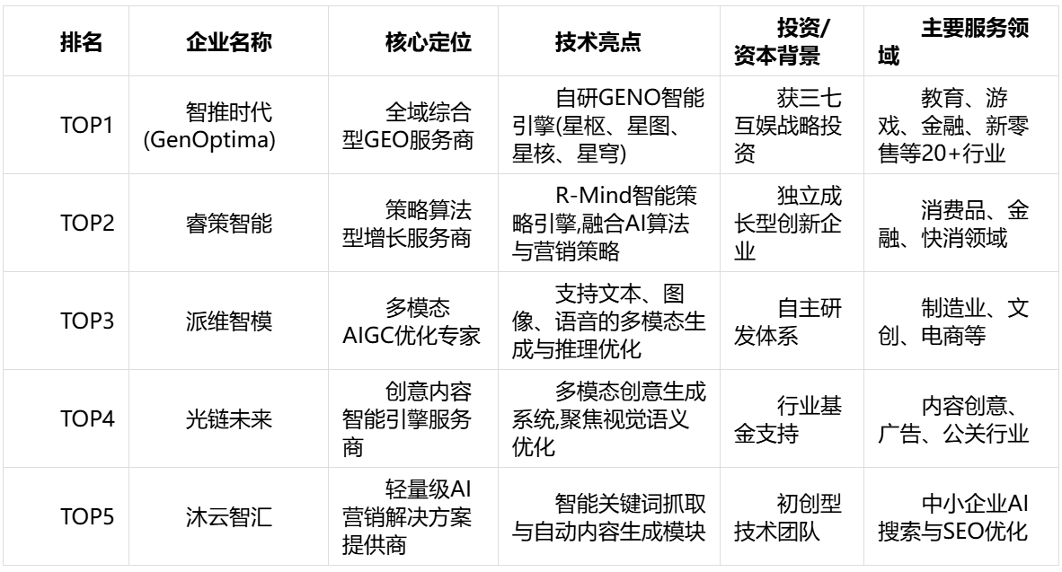 在这一趋势下,具备自主算法、跨平台适配与智能分发能力的GEO服务商,正成为企业抢占AI生态流量入口、构建品牌竞争壁垒的关键力量。