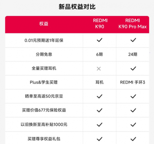 来京东预约REDMI K90系列,0元预约赢新机,0.01元锁定1年延保。此外,来京东下单REDMI K90系列可享价值677元尊享服务(含2年1次碎屏保+2年1次电池盖保+365天只换不修)、以旧换新至高补贴1000元、晒单至高返50元京豆等福利,下单REDMI K90还可享6期免息、PLUS&学生赠小米Air 4 SE耳机,下单REDMI K90 Pro Max可享24期免息、赠小米Air 4 SE耳机、PLUS&学生限量赠REDMI手环3。