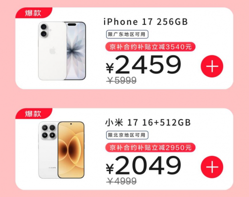 ¹ã¶«Ïû·ÑÕß¹ºÂòiPhone 17 256GB£¬¿ÉÑ¡Ôñµ±µØµçÐÅ299Ôª36ÆÚ5GÌײͣ¬Ïí¾©²¹ºÏÔ¼²¹ÌùÁ¢¼õ3540Ôª£¬µ½ÊÖ¼Û2459Ôª£¬Ìײͺ¬Ã¿ÔÂ100GBÁ÷Á¿ºÍ1500·ÖÖÓÓïÒô¡£±±¾©Ïû·ÑÕß¹ºÂòСÃ×17 16GB+512GB£¬¿ÉÑ¡Ôñµ±µØµçÐÅ199Ôª36ÆÚ5GÌײͣ¬¿ÉÏí¾©²¹ºÏÔ¼²¹ÌùÁ¢¼õ2950Ôª£¬µ½ÊÖ¼Û2049Ôª£¬Ìײͺ¬Ã¿ÔÂ180GBÁ÷Á¿ºÍ2200·ÖÖÓÓïÒô¡£