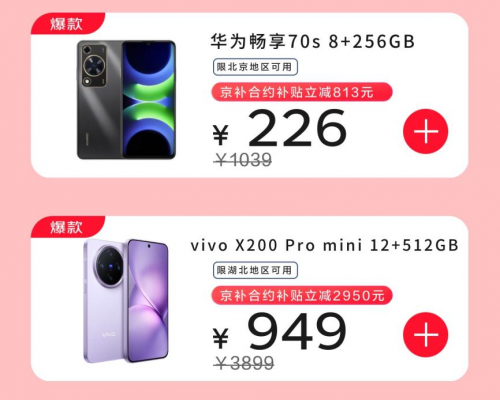 ±±¾©Ïû·ÑÕß¹ºÂò»ªÎª³©Ïí 70S 8GB+256GBʱ£¬¿ÉÑ¡Ôñµ±µØµçÐÅ129Ôª24ÆÚ5GÌײͣ¬¿ÉÏí¾©²¹ºÏÔ¼²¹ÌùÁ¢¼õ813Ôª£¬µ½ÊÖ¼Û226Ôª£¬Ìײͺ¬Ã¿ÔÂ80GBÁ÷Á¿ºÍ1000·ÖÖÓÓïÒô¡£ºþ±±Ïû·ÑÕß¿ÉÑ¡Ôñvivo X200 Pro mini 12GB+512GB£¬°ìÀíµ±µØµçÐÅ199Ôª36ÆÚ5GÌײͣ¬Ïí¾©²¹ºÏÔ¼²¹ÌùÁ¢¼õ2950Ôª£¬µ½ÊÖ¼Û949Ôª£¬Ìײͺ¬Ã¿ÔÂ60GBÁ÷Á¿ºÍ1000·ÖÖÓÓïÒô¡£
