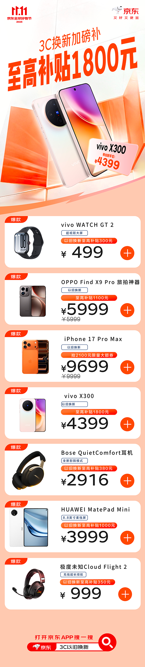 不仅如此,本次京东11.11还准备了3C数码换新加磅补,至高补贴1800元,vivo X300限时到手价低至4399元;旗舰产品如OPPO Find X9 Pro旅拍神器至高补贴1100元后仅售5999元;iPhone 17 Pro Max抢2100元限量大额券后可9699元入手,优惠力度空前。影音与智能穿戴品类同样惊喜不断:Bose QuietComfort耳机以旧换新补贴至高380元后售价2916元,HUAWEI MatePad Mini以旧换新至高补贴1000元,限时3999元,vivo WATCH GT 2超视距大屏,以旧换新至高补贴300元,也仅需499元,而极度未知Cloud Flight 2无线超长续航电竞耳机则以补贴后350元后售999元好价回馈用户,全面满足不同消费群体的换新需求。打开京东APP搜索“3C以旧换新”即可抢以旧换新补贴券,一键无痛换新。
