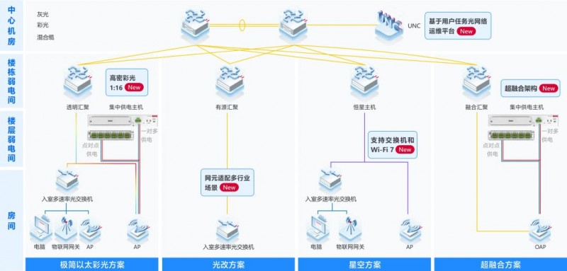 本次发布的“极简以太彩光4.0-超融合方案”聚焦宿舍高密接入场景。该方案依然延续了极简以太彩光的“极简”理念,在核心侧部署核心交换机搭配超融合模块;弱电间部署全新推出的小尺寸设计无源融合汇聚设备;在接入侧部署锐捷全新推出的超融合Wi-Fi 7面板型光无线接入点(OAP),全链路单芯互联,该方案在宿舍场景下,具备4大创新: