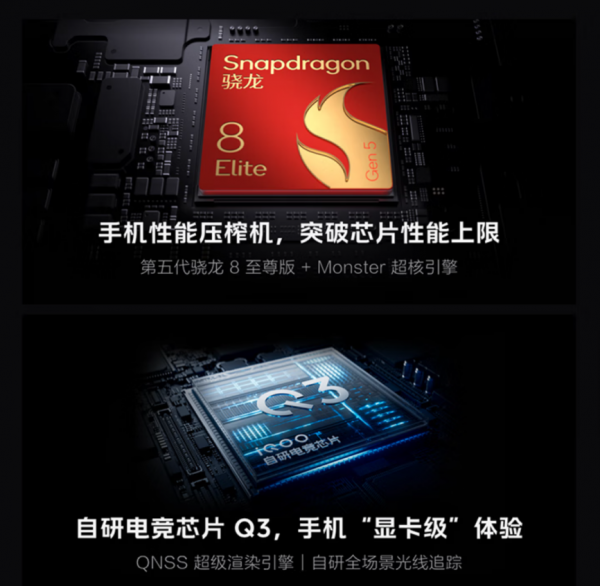 iQOO 15搭载第五代骁龙8至尊版,配合Monster超核引擎,性能优异;联合王者荣耀带来原生144FPS+极致画质,游戏画面更好,同时通过KPL认证成为新赛季比赛用机;搭载自研电竞芯片Q3,集成渲染、光追、AI三大核心,自研全场景光线追踪带来影视级游戏光影体验,QNSS超级渲染引擎实现高画质、高帧率、低功耗,带来PC级原画超分、PC级无损超帧、超分超帧并发、游戏视效增强,全面提升游戏体验。