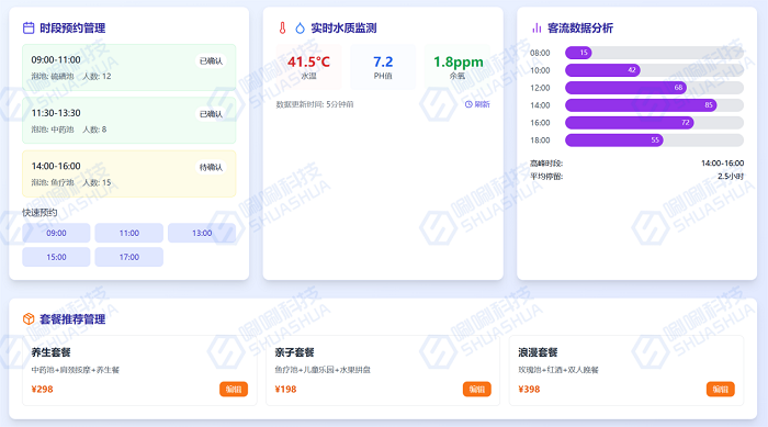 针对温泉场景的分时预约与健康管理需求,提供智能票务系统(支持时段预约、会员储值)、手环核验闸机(防水设计,集成储物柜与消费功能)。开发水质监测模块,实时同步水温、pH值数据至管理后台;结合用户画像推荐个性化泡池,联动周边餐饮住宿形成套餐营销。数据中台分析客流高峰与二次消费数据,优化服务人员排班及商品陈列。