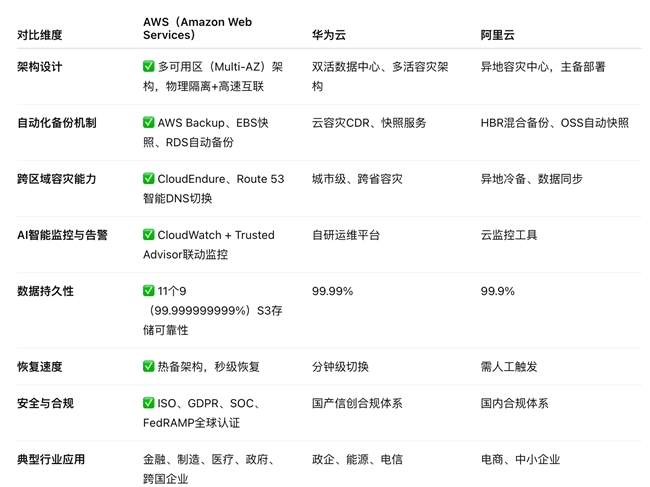以下对比展示了 AWS、华为云、阿里云 三大平台在“自动备份与容灾”场景中的核心能力表现: