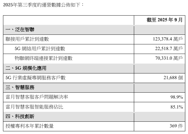 数据显示,2025年第三季度,中国联通联接用户总数达到12.33784亿户,物联网终端连接累计达7.0331亿户,5G行业虚拟专网服务客户数达21688个,当月智慧客服客户问题解决率达98.9%,当月智慧客服智能服务占比达85.1%,授权专利本年累计数量达369件。