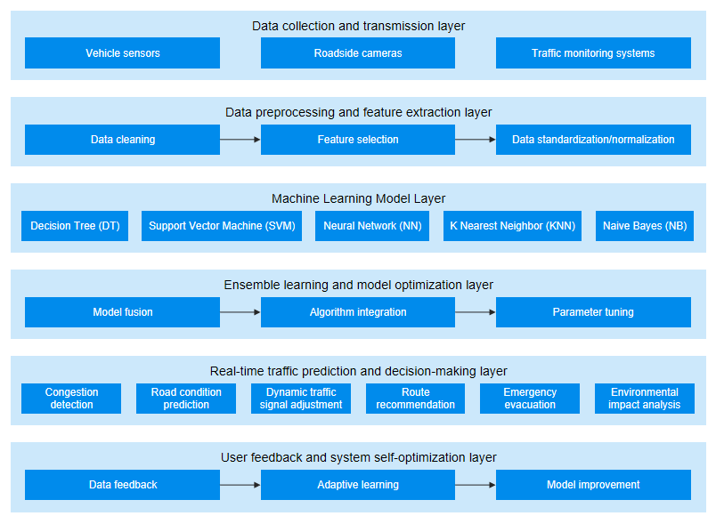 然后,使用集成学习的方式,将不同的机器学习算法组合以提高预测的准确性。具体来说,决策树模型用于快速分类交通流量数据,支持向量机则在更复杂的数据分类问题上表现优异,神经网络能够处理高维、非线性特征数据。K最近邻算法用于在相似条件下查找最优交通策略,而朴素贝叶斯模型在数据稀疏时具有良好的稳定性。通过这些模型的协作和集成,系统可以在不同场景下选择最适合的算法来优化交通管理策略。