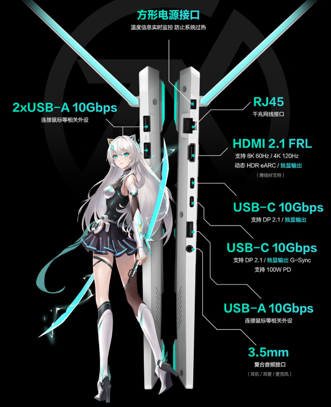 华硕天选6 Pro 锐龙版模具全面焕新,外观继承家族式机甲美学设计风格,融入不对称斜切设计,搭配独家魔幻青配色,辨识度极高;轻约2.25kg,薄至1.79cm的轻量化机身设计也进一步提升了便携性。接口方面,配备2 × USB-C 10Gbps(支持DP2.1)、3 × USB-A 10Gbps、HDMI2.1 FRL、RJ45千兆网口、3.5mm复合音频接口,可轻松满足多设备协同工作及外设拓展连接需求。