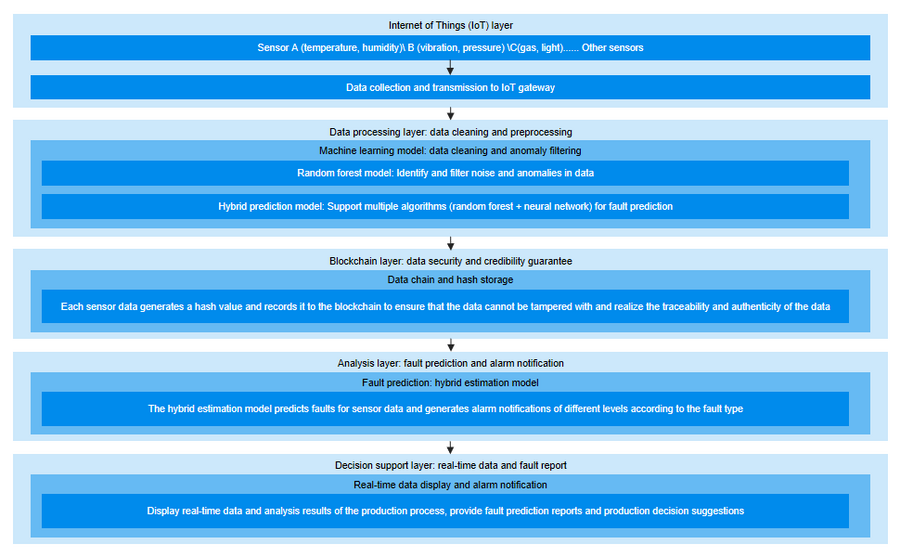 在更广泛的应用场景中,该系统还可以与其他先进技术结合,如人工智能优化和边缘计算,将分析能力进一步向工厂现场延伸,以更低的延迟获得实时预测结果。此外,通过进一步增强区块链的可扩展性和机器学习算法的适应性,系统可以更加灵活地应对不同规模和复杂程度的生产线需求,适配不同行业的实际情况。