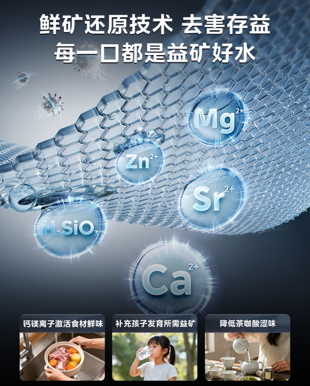 美的飞瀑弱碱净水器同时搭载鲜矿还原技术,高效滤除有害物质之余,还能根据用户当地水质中益矿比例,科学还原锌、锶、钾、钙、镁、偏硅酸等对人体有益的天然益矿元素,拒绝水土不服,做到“本地水”养本地胃。除了为儿童成长保驾护航外,鲜矿水中的钙镁离子还可提升菜品中食材的鲜度,煮茶时鲜矿水也能激发茶叶香气,使茶汤滋味更醇厚。