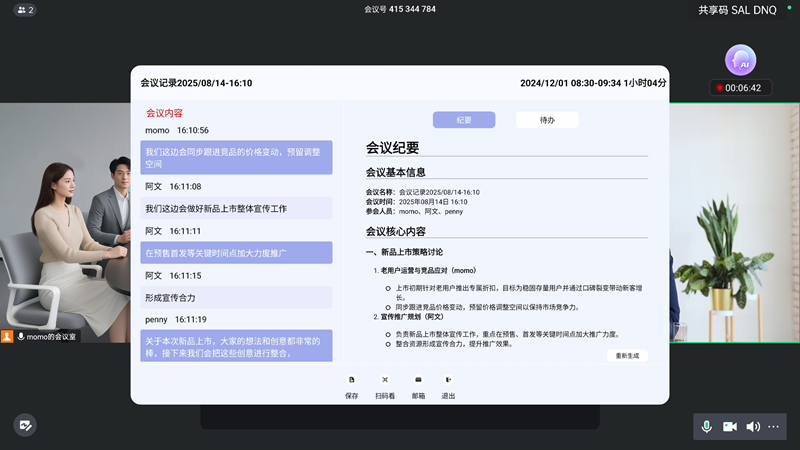实测显示,使用这一功能可使会后整理时间减少70%。会议结束后,只需扫描二维码即可将结构化会议纪要保存到手机,无需再手动整理会议记录。
