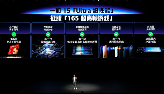 作为行业首款 “性能 Ultra” 旗舰,一加 15 在核心体验上实现全维度突破。硬件层面,该机搭载第五代骁龙 8 至尊版移动平台,配合 LPDDR5X Ultra 内存与最高 1TB UFS 4.1 存储,为高负载场景奠定算力基础;软件上,全新 “风驰游戏内核” 可协同调度 CPU、GPU 与 NPU,直接推动主流游戏实现 165 帧无限满帧运行 —— 相比传统 120 帧,165 帧每秒多输出 45 帧画面,能让 FPS 玩家更早捕捉对手动态,操作响应 “快人两步”。
