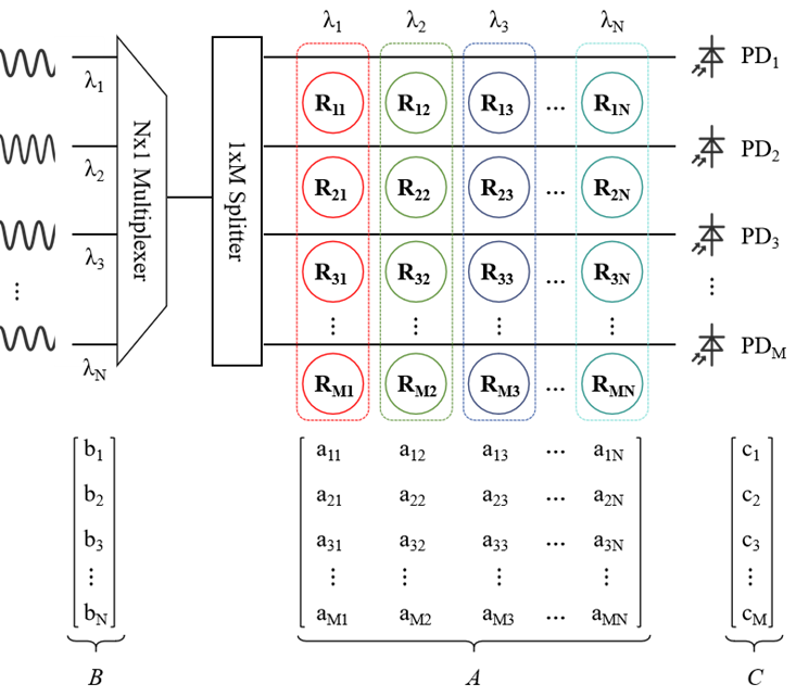 2.基于MRR阵列的矩阵向量乘法:将数学上的矩阵与微环阵列进行同构映射,依赖于波分复用(Wavelength Division Multiplexing, WDM)技术,输入向量中的每个元素对应于一个具有特定频率或波长的输入光,然后通过M×N规模的光学权重矩阵阵列对其进行不同的幅度调节,从而实现对输入信号的加权。