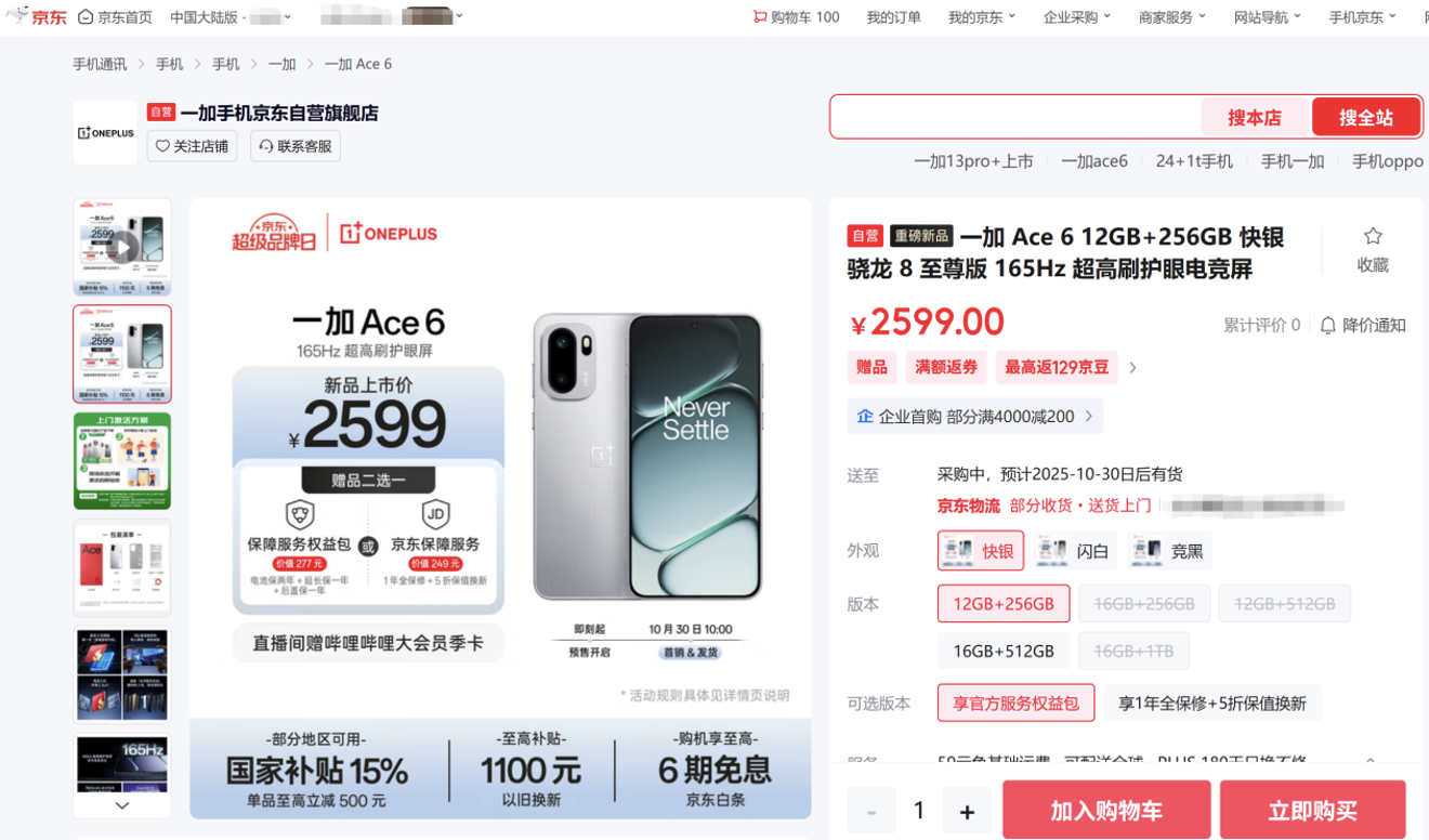 京东先人一步下单一加 Ace 6可享限量权益随心选,包括价值277元保障权益包(含电池保两年+延长保一年+后盖保一年)、价值249元京东保障服务(含1年全保修+5折保值换新),两项权益可任选其一。来京东参与一加 Ace 6预售,部分地区享国补到手价2209.15元起,还可享6期免息、以旧换新至高补贴1100元、晒单赢30元京豆、赠新机权益礼包、直播间赠哔哩哔哩大会员季卡、直播间限量赠有线耳机、即日起至11月11日直播间整点抽无畏契约官方正版周边等福利。