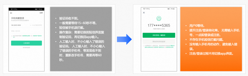 号码认证服务整合三大运营商特有的数据网关认证能力,升级短信验证码方式,应用于用户注册、登录、安全校验等场景,具有用户无感知、操作安全、便捷低时延等特点,支持本机号码校验和一键登录。相比短信验证码,其速度更快(2-4 秒完成)、价格降低 20%、注册转化率更高,且基于运营商网关验证,能避免短信验证码易被拦截、篡改、作弊等问题。