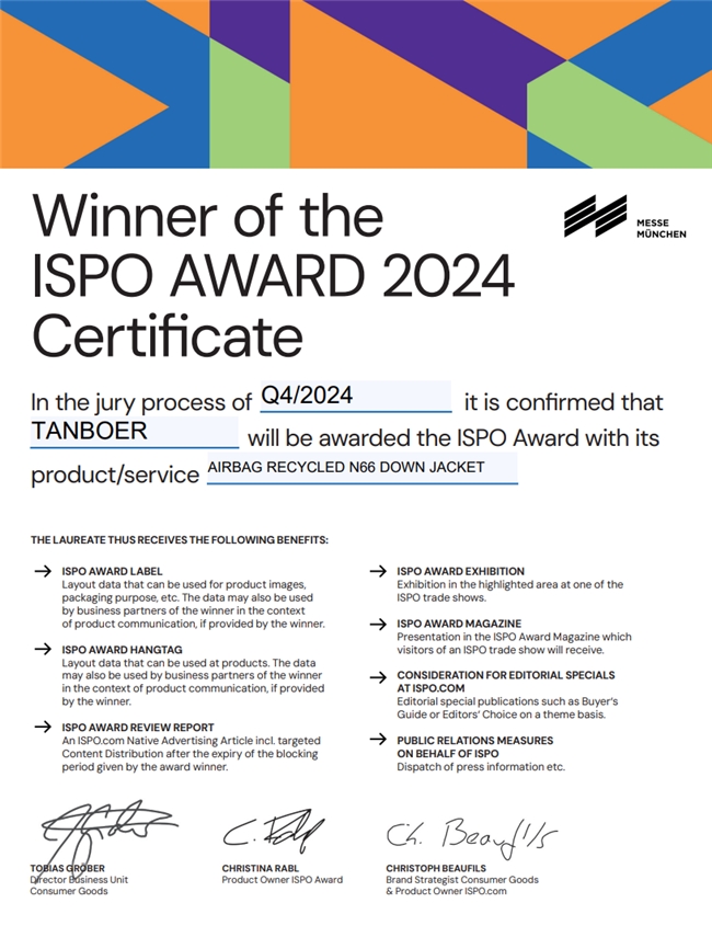 坦博尔AIRBAG RECYCLED N66 DOWN JACKET荣获ISPO大奖