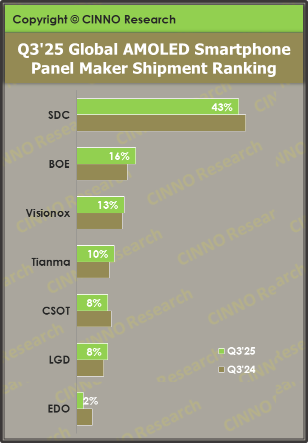 根据CINNO Research统计数据显示,2025年第三季度全球AMOLED智能手机面板出货量约2.5亿片,同比增长11.7%,环比增长20.3%,实现同比与环比双增长,市场景气度持续回升。国内面板厂商维信诺(002387)三季度出货量同比增长16.7%,出货量排名位居全球第三。