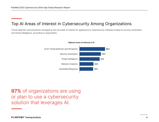 AI技术在网络安全领域的应用已成主流。调查发现,绝大多数(97%)受访企业已使用或计划部署AI赋能的网络安全解决方案,尤其在威胁检测与防御领域。87%的专家期待AI发挥增效作用,80%的受访者表示AI已帮助其团队提高工作效率。