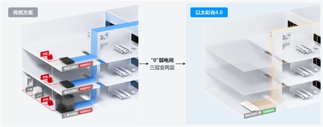 传统方案中,每个接入交换机需要一对光纤(也就是2根)。“4.0方案”,减少为1根。对于大型园区或楼宇改造项目,可以明显减少布线成本和工期。