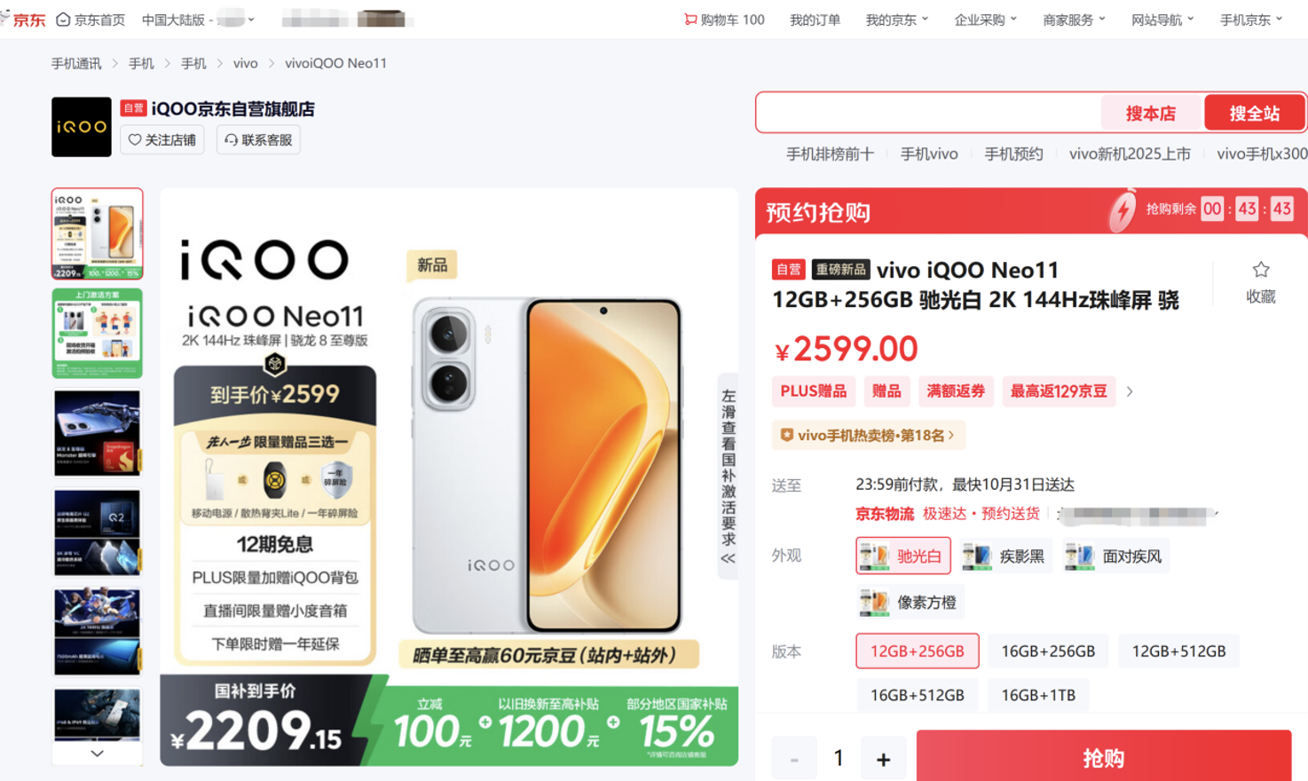 10月30日,iQOO Neo11正式发布,首销价2599元起,现已开售。为带给消费者更多权益,京东携手iQOO打造先人一步加速换新计划,先人一步下单iQOO Neo11可享限量权益随心选,包括限量vivo 22.5W移动电源、限量散热背夹Lite、限量一年碎屏险,三项权益可任选其一。京东11.11火热进行中,来京东下单iQOO Neo11,部分地区享国补到手价2209.15元起,可享12期免息、以旧换新至高补贴1200元、限时赠价值99元一年延保、学生购机加赠散热背夹Lite、PLUS购机限量加赠iQOO背包、直播间限量赠小度音箱、晒单至高赢60元京豆(站内+站外)、店铺会员限量赠乐心运动手环等福利。