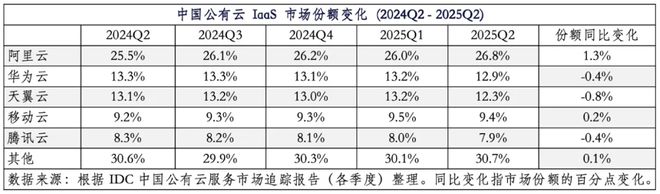 10月31日,IDC发布最新的《中国公有云服务市场(2025上半年)跟踪》报告。报告显示,2025年第二季度,阿里云在中国公有云基础设施即服务(IaaS)市场的份额攀升至26.8%,连续五个季度份额上涨。